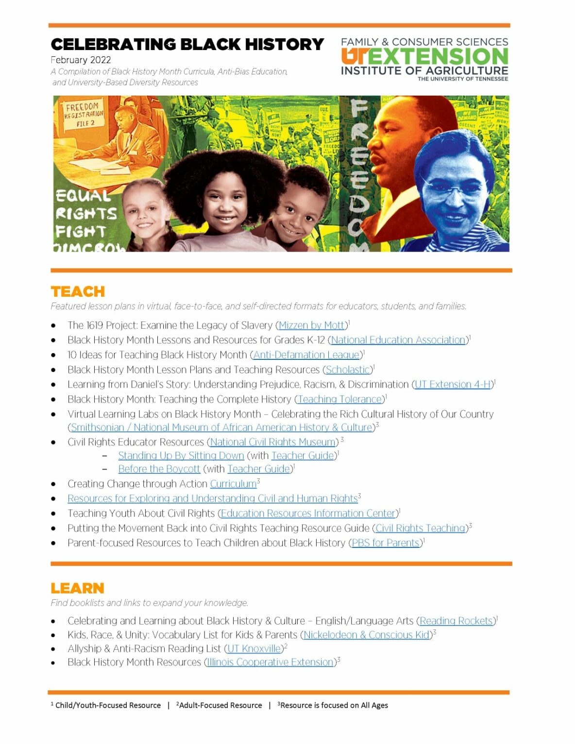 Here’s a resource sheet with several ideas for deepening an understanding of racial justice in acknowledgement of Black History Month. Several (free!) activities, suggested events, and resources are featured to help your family celebrate the accomplishments of many notable Black History figures. #UTExtensionAfterschool Source