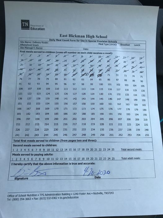 A meals number checklist for yesterday’s deliveries. Source