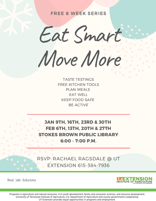This is free for families. Do you want to make healthier choices in 2020? Come join us next year at the Stokes Brown Public Library for a FREE 8 week series. Try new recipes and learn how to eat healthy on a budget. Source
