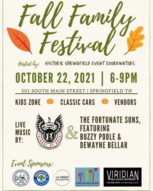 The City of Springfield, TN – Government and Historic Springfield Events have partnered to reschedule the October 1st First Friday Night Market into a special Fall Festival for October 22nd! Springfield Parks and Recreation is sponsoring the live music, Mr. Perry’s School of Rock and The Fortunate Sons, featuring Buzzy Poole and Dewayne Bellar. Source