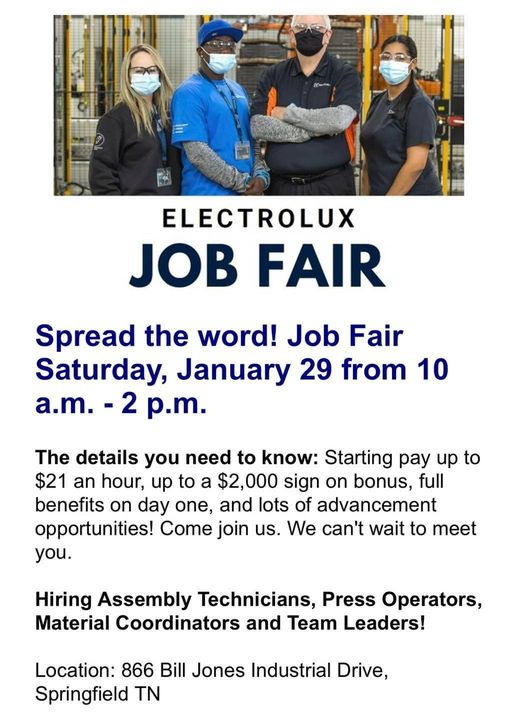 Spread the word. Electrolux is holding a #jobfair for assembly technicians, press operators, material coordinators and team leader positions this Saturday from 10:00 am – 2:00 pm. Source