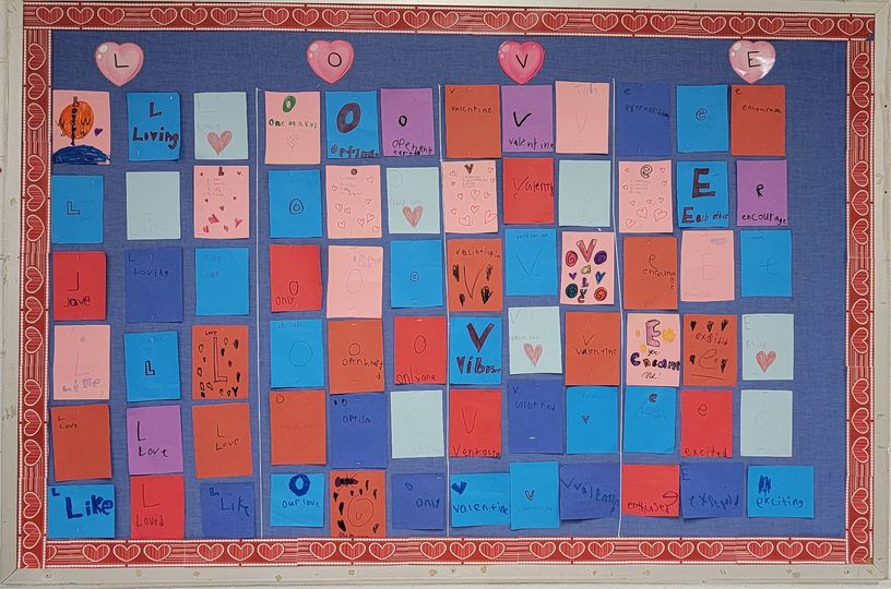 The kiddos decorated the bulletin board for Valentines Day. They took on some word association with the letters of Love that went along with Valentines Day. Source