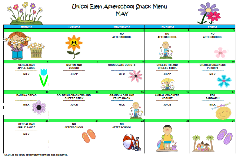 May Snack Menu…Our last day of afterschool will be Monday, May 20th. Be sure to pickup your fall applications. Source