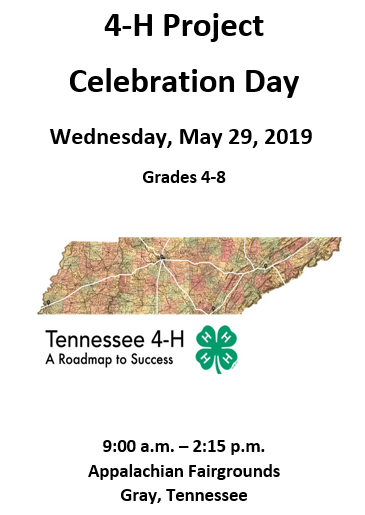 REMINDER TO STUDENTS & PARENTS PARTICIPATING IN “4H PROJECT CELEBRATION DAY”: Students will need to be at the Unicoi Elementary School by 8:15 AM tomorrow, May 29th if they plan to ride the bus. We will not serve breakfast, so please make sure they eat at home. Students will return to Unicoi Elementary between 2:45 and 3:00 PM. Source