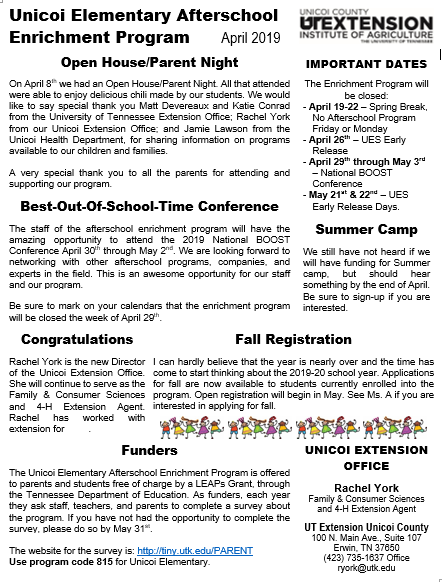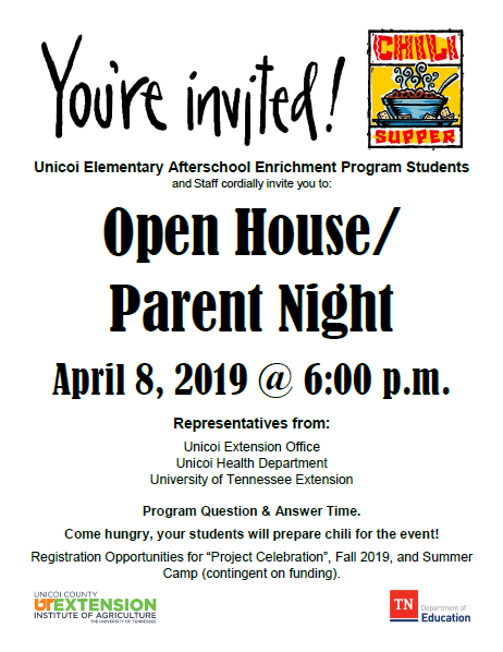 Open House was AWESOME! The kids (and teachers) made delicious chili for everyone. We had a wonderful evening filled with laughter, fun, and great information. Thank you Matt Devereaux and Katie Conrad fron the UT Extension Office; Rachel York from our Unicoi Extension Office; and Jamie Lawson from the Unicoi Health Department, for sharing information on programs for our children. … Read More